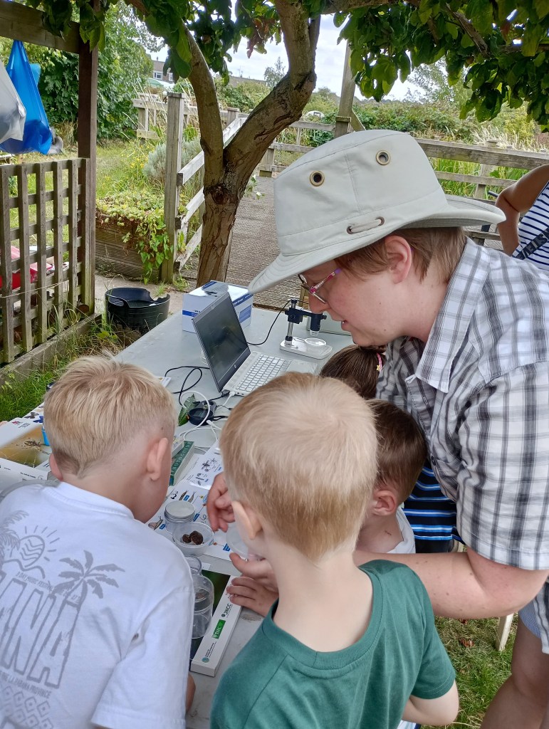 Searching for and identifying invertebrates on site, using small pots, brushes and magnifiers. Discussing and demonstrating how to safely handle and search for bugs.